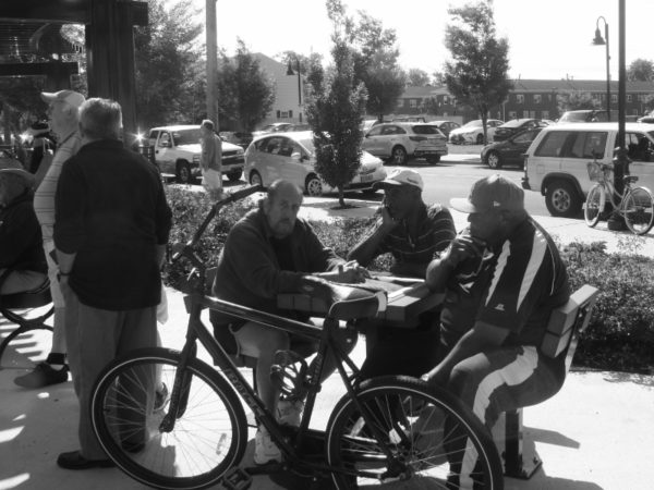 My next interaction was with a white man that I photographed playing a board game with two black men. He joked that they were so old that the photo should be black and white. I told him that would be appropriate and happily oblige.