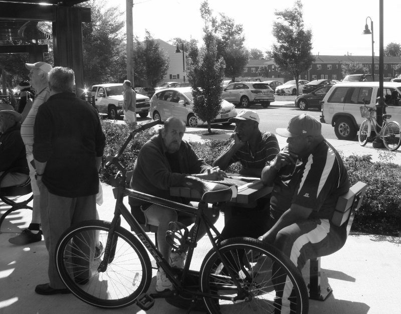 My next interaction was with a white man that I photographed playing a board game with two black men. He joked that they were so old that the photo should be black and white. I told him that would be appropriate and happily oblige.