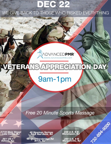 Advanced Physical Medicine & Rehabilitation has declared Saturday, December 22 to be Veterans Appreciation Day. The company is Giving Back To Those Who Risked Everything Thing with free 20 minute sports massages for military veterans, as well as active duty and reservists, at all six of their Central Jersey locations from 9 a.m. until 1 pm.