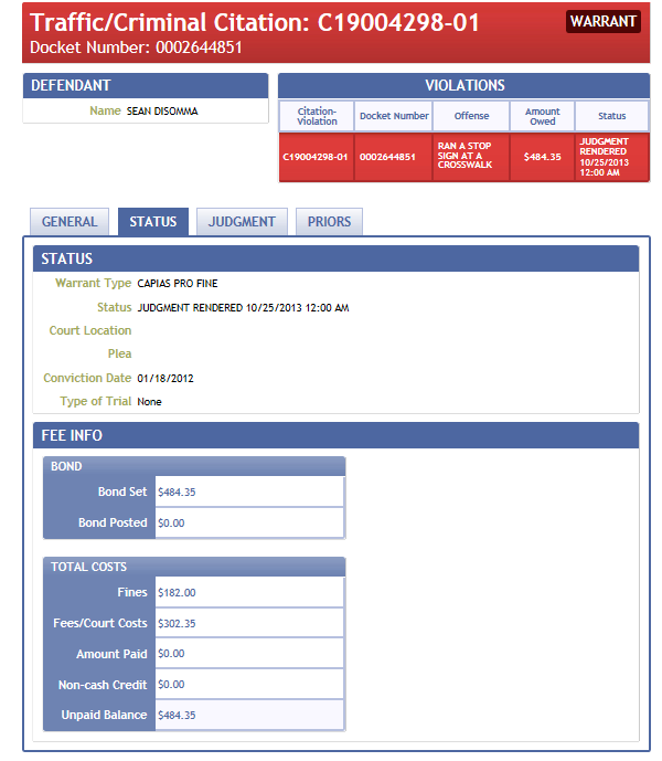 On Thursday night and Friday morning the Dallas Court’s website indicated that there was no warrant for DiSomma. Click here for that screenshot.