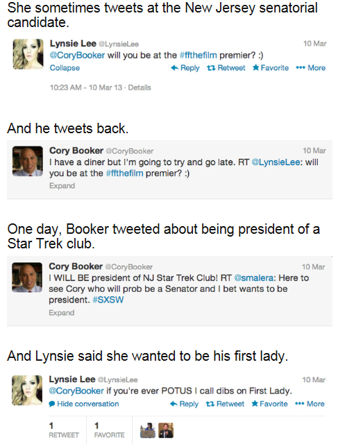 Booker follows @LysnieLee on twitter. They share public and private messages in the wee hours of the morning. BuzzFeed says their cyber relationship started because they were both in a film about twitter, #ffthefilm.