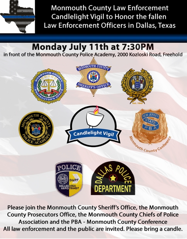 Join Sheriff Shaun Golden, the Monmouth County Sheriff’s Office, the Monmouth County Prosecutor’s Office, the Monmouth County Chiefs of Police Association and PBA – Monmouth County Conference along with Law Enforcement and Clergy from Monmouth County to honor the fallen Dallas Law Enforcement officers during a Candlelight Vigil on Monmouth July 11, 7:30 p.m. at the Monmouth County Police Academy, 2000 Kozloski Rd, Freehold.