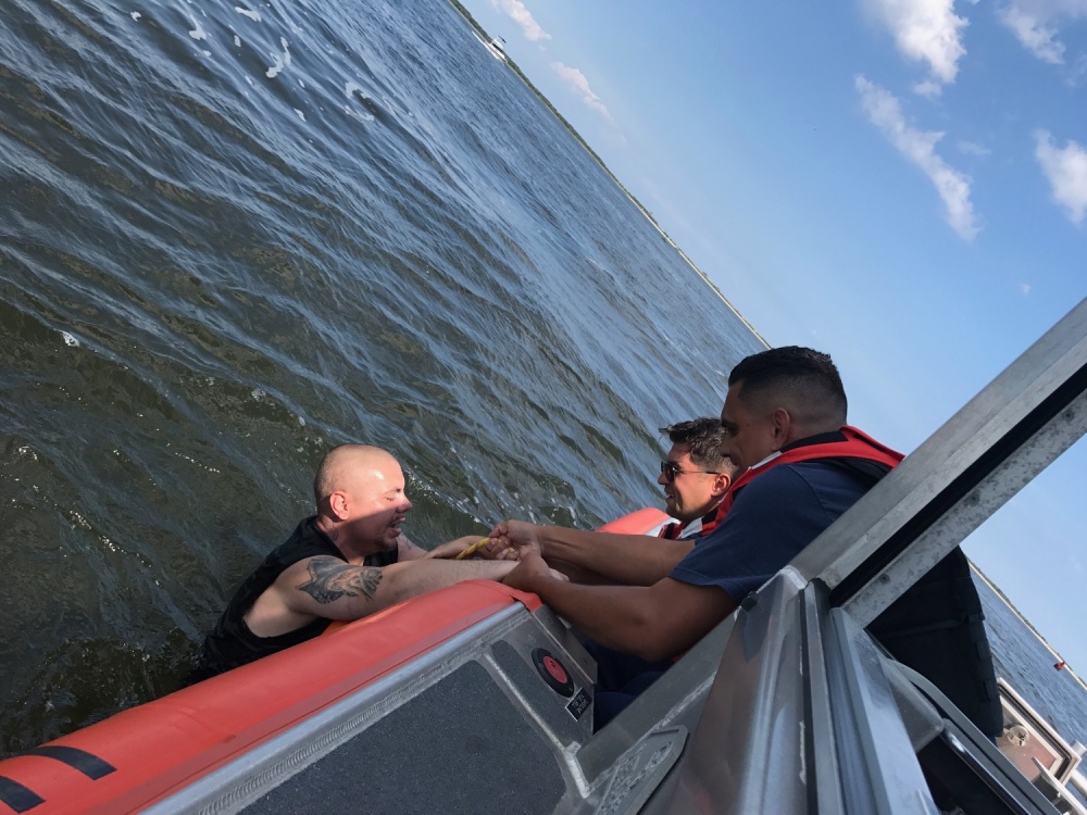A Coast Guard boatcrew from Sandy Hook Station pulled three people out the the Sandy Hook Bay near Highlands this afternoon, according to a press release by the USCG.