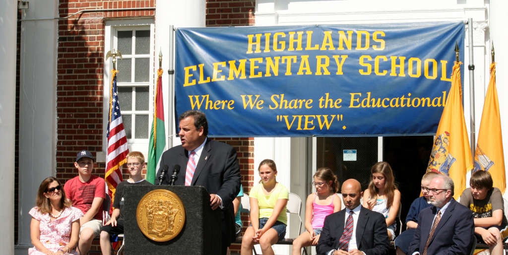 Governor Chris Christie and First Lady Mary Pat Christie visited Highlands Elementary School this morning to accept a $4.5 million dollar gift to the Hurricane Sandy Relief Fund from the United Arab Emirates (UAE). Ambassador to the United States Yousef Al Otaiba made the presentation and, along with the Christies, met with students of the school’s Summer Camp Program.