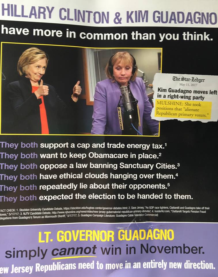 Assemblyman Jack Ciattarelli’s recent attack on Lt. Governor Kim Guadagno appears to be backfiring. The oversized glossy postcard comparing Guadagno to Hillary Clinton is drawing angry comments on social media and pledges to work for Kim’s nomination on June 6.