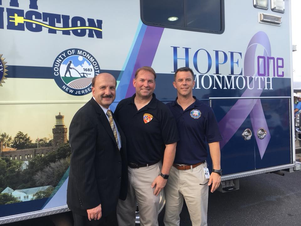 Ocean County Prosecutor Joe Coronado, Monmouth County Sheriff Shaun Golden and Monmouth County Prosecutor Christopher Gramiccioni celebrate the launch of HOPE One