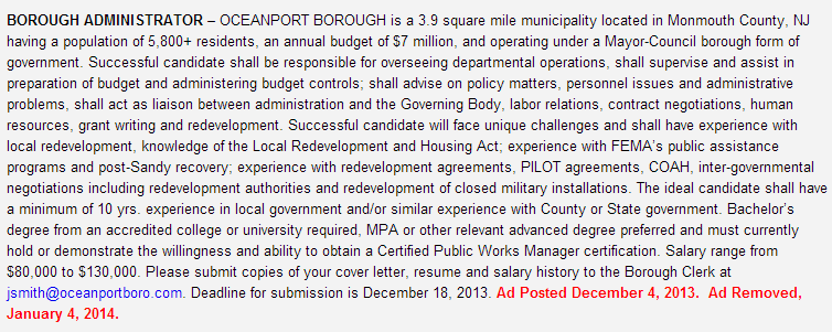 Posted: December 23rd, 2013 | Author: Art Gallagher | Filed under: John Bennett, Monmouth GOP, News, Oceanport | Tags: John Bennett, John O. Bennett III, Oceanport | Comments Off on Oceanport Is Advertising For A Borough AdministratorBennett: Supreme Court Decision Does Not Apply To His Oceanport Job