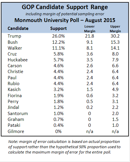 Donald Trump has a 2-1 lead over his next closest competitor, former Florida Governor Jeb Bush, for the 2016 Republican presidential nomination and New Jersey Governor Chris Christie seems assured of a spot in the “Top Ten” prime time debate sponsored by FoxNews and facebook on Thursday evening, according to a Monmouth University Poll released this morning.