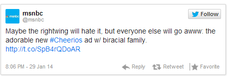 In a memo to All Republican Elected Officials, Strategists, Surrogates, and Pundits and in an email to contributors, Republican National Committee Chairman Reince Priebus called for a national boycott of MSNBC until the cable network’s president, Phil Griffin, apologizes for a tweet posted last night which suggested that the “rightwing” hates bi-racial families. The tweet linked to a Cheerios commercial featuring a bi-racial family using the breakfast cereal as a discussion prop between father and daughter, rather than as food.