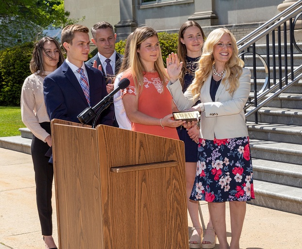 Monmouth County Clerk Christine Giordano Hanlon was sworn in as President of the Monmouth County Bar Association on Thursday in a socially distanced ceremony presided over by Assignment Judge Lisa P. Thornton outside the County Courthouse.
