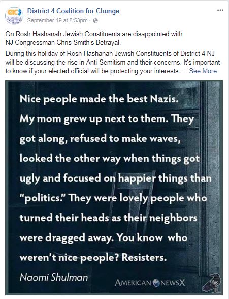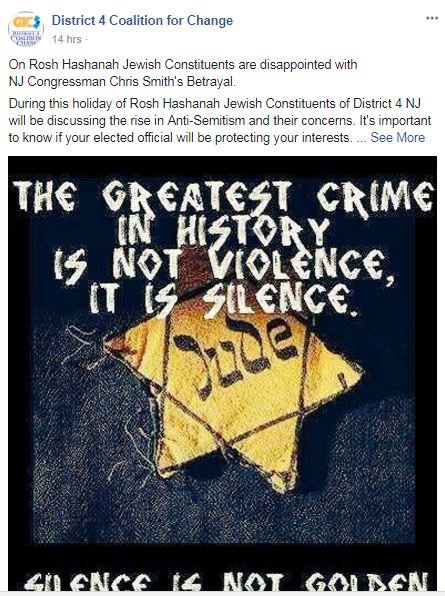 This week, less than a month after they accused MMM of using old posts to slander their good work, D4CC commemorated Rosh Hashanah by depicting Congressman Chris Smith as an anti-Semite and a Nazi –twice. Sweet.