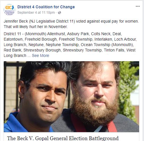 Gopal is busy trying to defeat Senator Jennifer Beck by characterizing her as a puppet of Governor Chris Christie. This despite the fact that Beck called for Christie to either resign his office or stop traveling the country campaigning for Donald Trump’s presidential campaign in 2016. Beck also agreed to sponsor legislation that would have appointed a special prosecutor to investigate Christie’s role in Bridgegate.