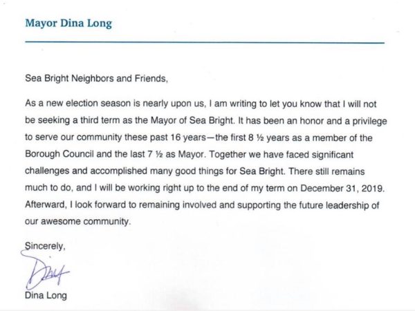 Sea Bright Mayor Dina Long announced on facebook and twitter this morning that she will not seek a third term leading the borough.