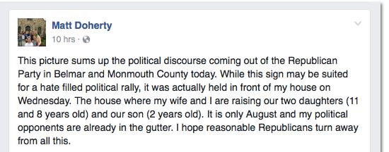 The following day in an apparent reaction to our article, Doherty posted a picture of a 17 year old boy holding a sign that said “The Mayor IS A LOSER” on his facebook page with a caption that blamed the protest on the Belmar and Monmouth County Republicans.