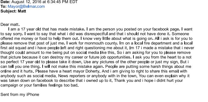 The mayor’s post got the young man in hot water at home, which prompted him to send an email to Doherty pleading that the post be removed from facebook, apologizing for participating in the protest and stated that he was offered money or food for participating in the protest.