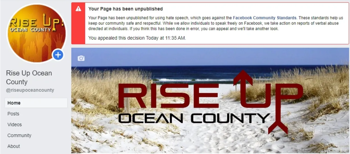 The decision to unpublish our page that was made this morning will have far reaching affects. Tomorrow we are scheduled for a lengthy interview with the Star Ledger here in New Jersey to discuss the efforts of Rise Up Ocean County and the transition that we are undergoing. For the record, the Star Ledger and their sister website www.nj.com have the highest news circulations in the state, unrivaled quite frankly. It would be tragic if that interview, that was intended to focus on over-development, the successes and failures of Rise Up Ocean County and our future path, turned into a five hour interview about Facebook, social media censorship and the willingness of an industry giant to buckle to the pressures being applied, under false pretenses we might add, by elected officials seeking to coddle a voting bloc. Truly, we LOVE Facebook and want our presence back, please.