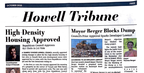 The Howell Tribune, a political hit piece filled with false and misleading content, claims that Berger blocked a proposed dump in the township and that Republican council members are behind the increase in residential development.