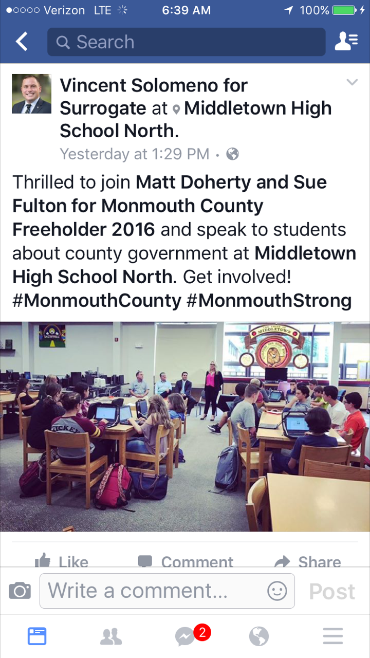 Screenshot of Surrogate Candidate Vincent Solomeno’s facebook post about campaigning in Middletown High School North. MMM has reduced the size of the photo to protect the identity of the students.