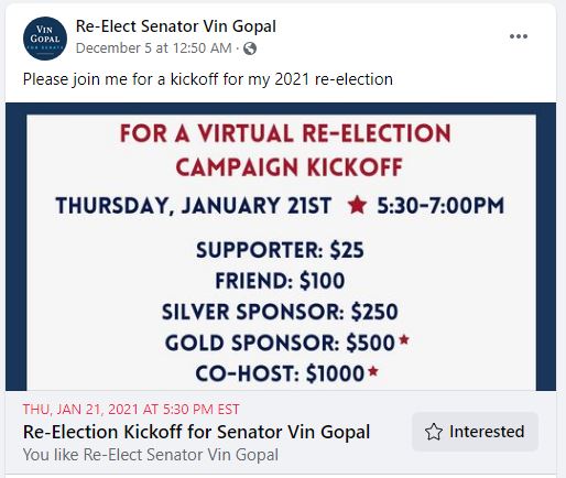 State Senator Vin Gopal of the 11th Legislative District renamed his public figure facebook page to Re-elect Senator Vin Gopal this morning and announced a virtual campaign kickoff event for January 21 over the weekend.
