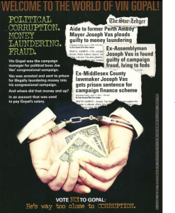 The Angelini/Casagrande campaign sent the above campaign mailer to voters, prompting Gopal to cry foul and claim that, although he was the campaign manager of the Vas campaign, he was not responsible for fundraising or accounting. The Asbury Park Press, columnist Bob Ingle and the Star Ledger came to Gopal’s defense, calling the mailer misleading and indecent. Gopal claimed he was just a 20 year old kid who managed the campaign for college credits.