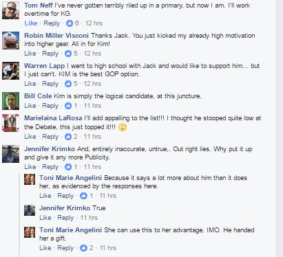 Assemblyman Jack Ciattarelli’s recent attack on Lt. Governor Kim Guadagno appears to be backfiring. The oversized glossy postcard comparing Guadagno to Hillary Clinton is drawing angry comments on social media and pledges to work for Kim’s nomination on June 6.
