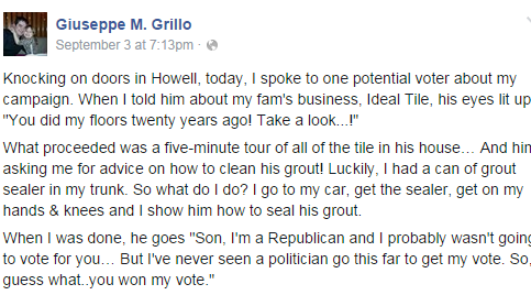 The couple should have called Giuseppe “Joe” Grillo, who when he was a Democrat Freeholder candidate in 2014 carried his grouting tools with him while campaigning door to door.