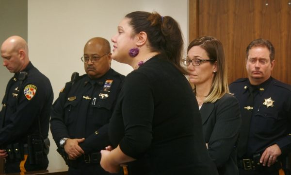 Danielle Procopio pleads with Judge Vincent Falcetano not to reduce Toni Ann Marletta’s seven year sentence while Assistant Prosecutor Meghan Doyle and Monmouth County Sheriff’s Officers look on.