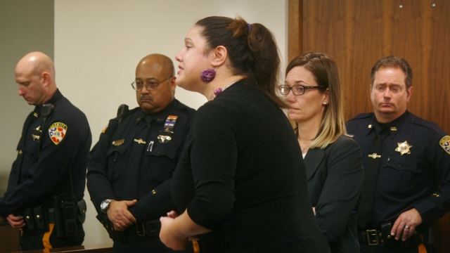 Danielle Procopio pleads with Judge Vincent Falcetano not to reduce Toni Ann Marletta’s seven year sentence while Assistant Prosecutor Meghan Doyle and Monmouth County Sheriff’s Officers look on.