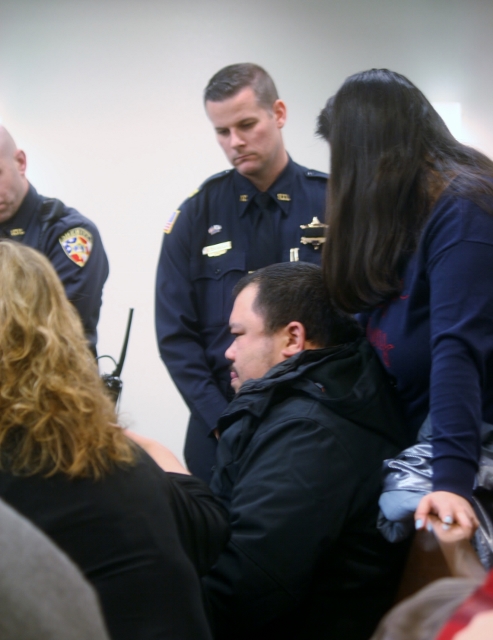 Michael Quan, the victim’s father, is comforted by a friend under the watchful eye of Sheriff’s Officers, following his outburst during Toni Ann Marletta’s re-sentencing for the hit and run death of his daughter.