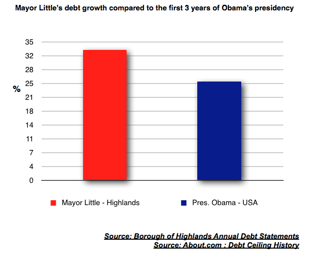 In the first three years of Obama’s term, the U.S. National Debt ballooned by 25%. Highlands’ debt under Mayor Anna Little exploded by 33% in the same time period.