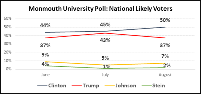 46% of registered voters support Clinton and 34% back Trump, with 7% supporting Libertarian Gary Johnson, and 2% backing Jill Stein of the Green Party. Support among likely voters stands at 50% Clinton, 37% Trump, 7% Johnson, and 2% Stein. In a poll taken days before the Republican convention in mid-July, Clinton held a narrow 43% to 40% lead among registered voters and a 45% to 43% lead among likely voters.