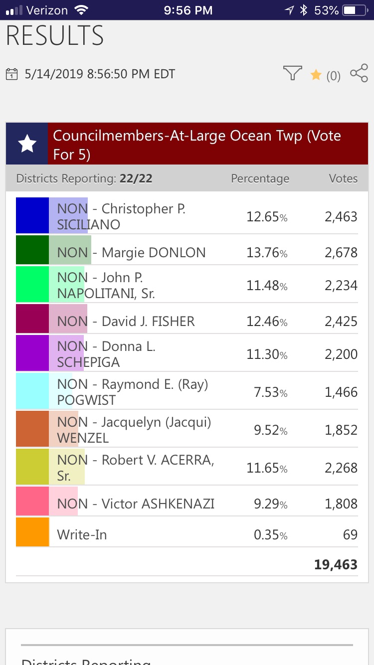 Barring an unexpected vacancy, Ocean Township’s council will be comprised of Margie Donlon MD, Christoper Siciliano, David Fisher DC, Rob Acerra and Napolitani upon the July 1 reorganization.