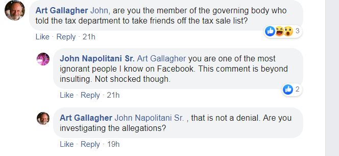 Councilman John Napolitani did not deny that he is the member of the governing body who directed favorable treatment from the tax department for friends of the community