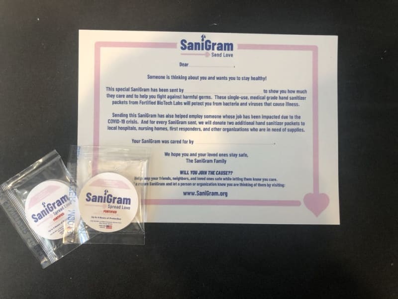 By purchasing a “SaniGram”, a person can send a friend or loved one a single-use hand sanitizer along with a message saying the sender cares, without the sender having to leave their home. Sending a SaniGra…
