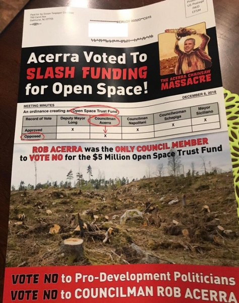 “It was probably Vin,” Siciliano said when asked who was behind the mailer which depicted Councilman Rob Acerra as the Texas Chainsaw muderer with a paid for disclosure by “Ocean Taxpayer Coalition, 700 Carol Ave, Oakhurst NJ 07755.”