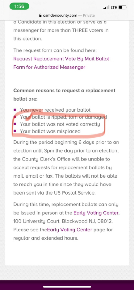 “Camden County’s website clearly states a common reason to request a duplicate mail in ballot is voting incorrectly on your ballot.