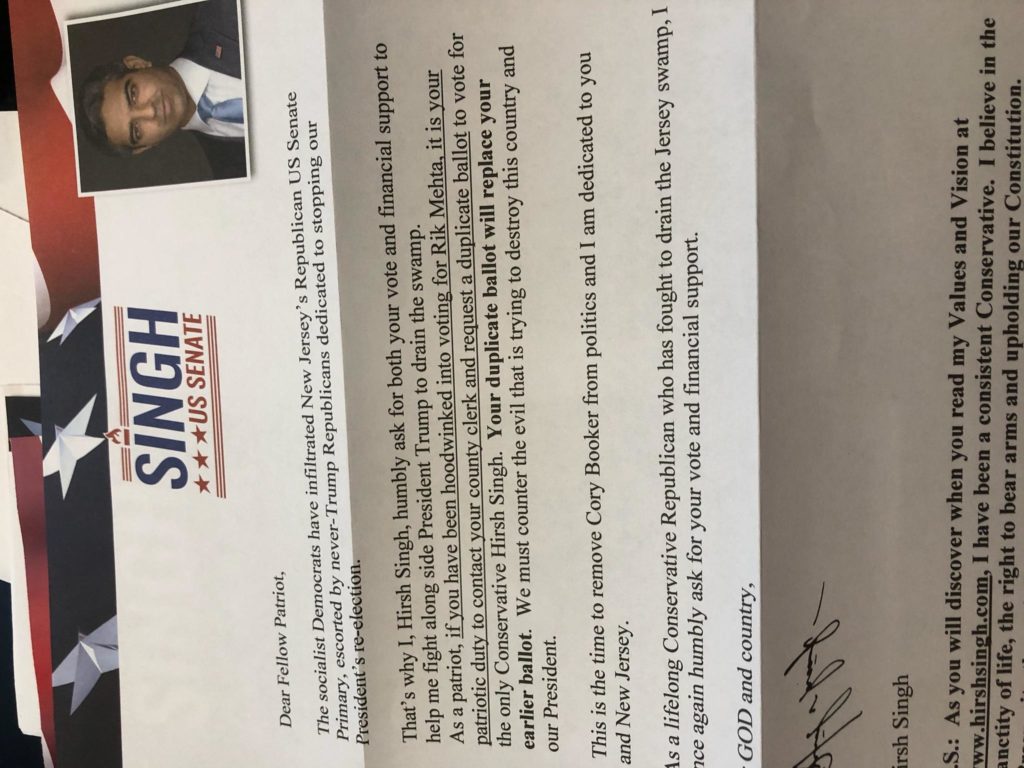 Hirsh Singh, a contender for the Republican nomination for U.S. Senate in the July 7 primary, says he has filed a complaint with the U. S. Department of Justice over the NJ Attorney General’s Cease and Desist letter demanding that he stop advising voters to request a duplicate ballot if they did not vote for him. The Cease and Desist letter also demanded that Singh provide the government with a list of voters to whom he sent his ‘hoodwinked letter.’