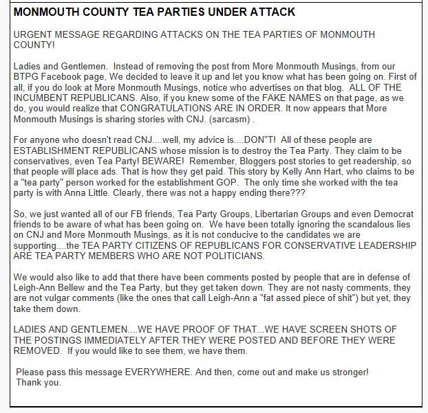 Bayshore Tea Party co-founder Barbara Gonzalez sent an email to her members this morning accusing MoreMonmouthMusings of basing its coverage of the LD 13 primary based upon who advertises on this site. Gonzalez posted an identical message on two Tea Party facebook groups and then blocked from MMM publisher Art Gallagher from the conversation after he responded.