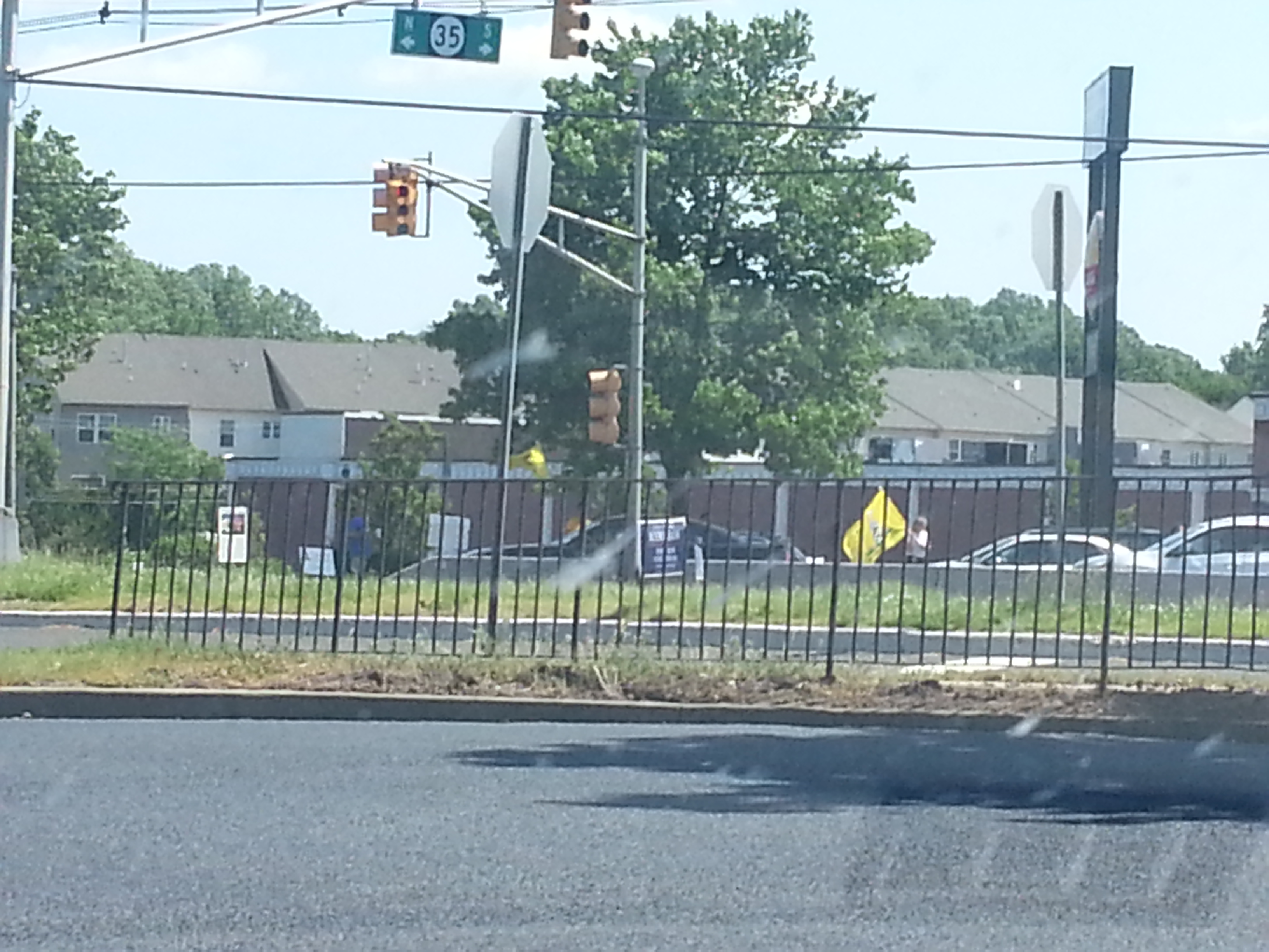 While Barbara was waving the flag on Route 35, her husband Frank was busy in the median installing their unreadable Column 3 signs in front of their competitor’s signs.