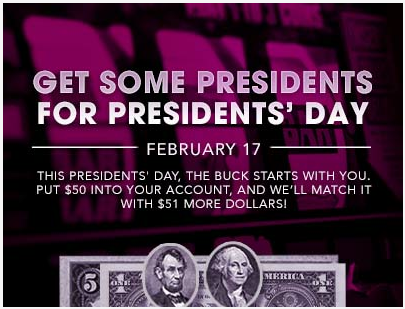 Dip into the treasury this Presidents’ Day. Lincoln is on the $5 bill, and Washington is on the $1 bill, and those are your lucky numbers! When you deposit $50 into your BorgataCasino.com account, you’ll get $51 more, on us. So get playing!