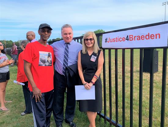 Congressman Smith meets with some of the 200 friends, family members and supporters of Braeden’s mother, Joanne Atkins-Ingram, who came out at the Aug. 1 memorial in Neptune. At left is Robert Ingram, Braeden’s step-father, and Jill Greene, Joanne’s attorney.