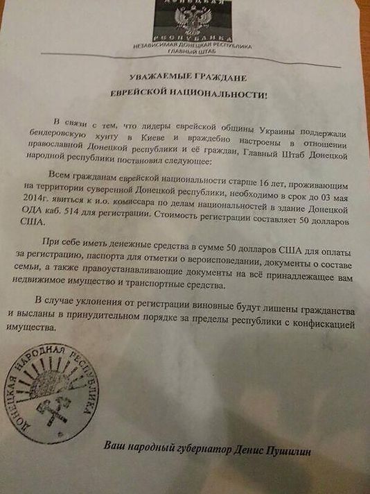 The leaflet begins, “Dear Ukraine citizens of Jewish nationality,” and states that all people of Jewish descent over 16 years old must report to the Commissioner for Nationalities in the Donetsk Regional Administration building and “register.”