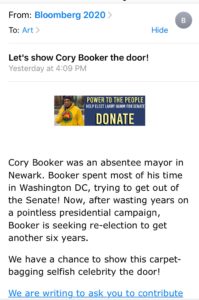 Booker, a Democrat candidate for the 2020 nomination to lose to President Trump, has not yet indicated if he will also seek reelection to the Senate. Under a recent law signed by Governor Phil Murphy, it is now legal for a former Newark mayor to run for Senate and either President or Vice President simultaneously.