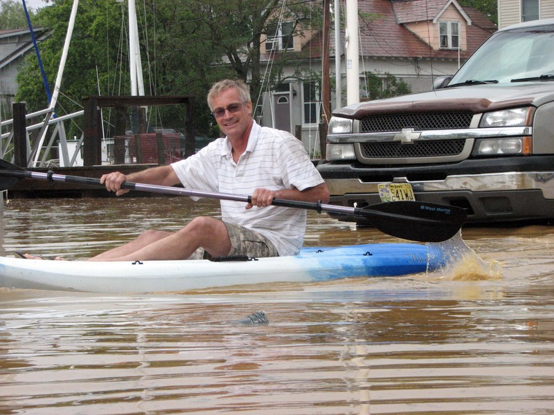 Highlands resident Derek Gordon street kayaking after this afternoon's storm. Photo credit: Brian Cobb
