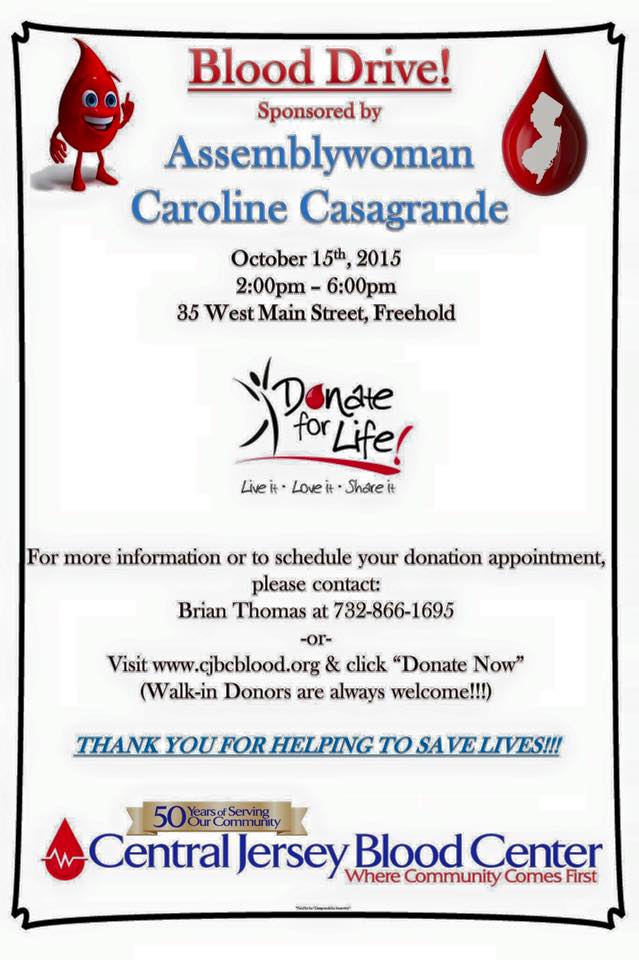 Posted: October 13th, 2015 | Author: admin | Filed under: 11th Legislative District, Caroline Casagrande, Monmouth County News | Tags: Assemblywoman Caroline Casagrande, Caroline Casagrande, Central Jersey Blood Center, Freehold, Monmouth County News | Comments Off on Blood drive in Freehold on Thursday