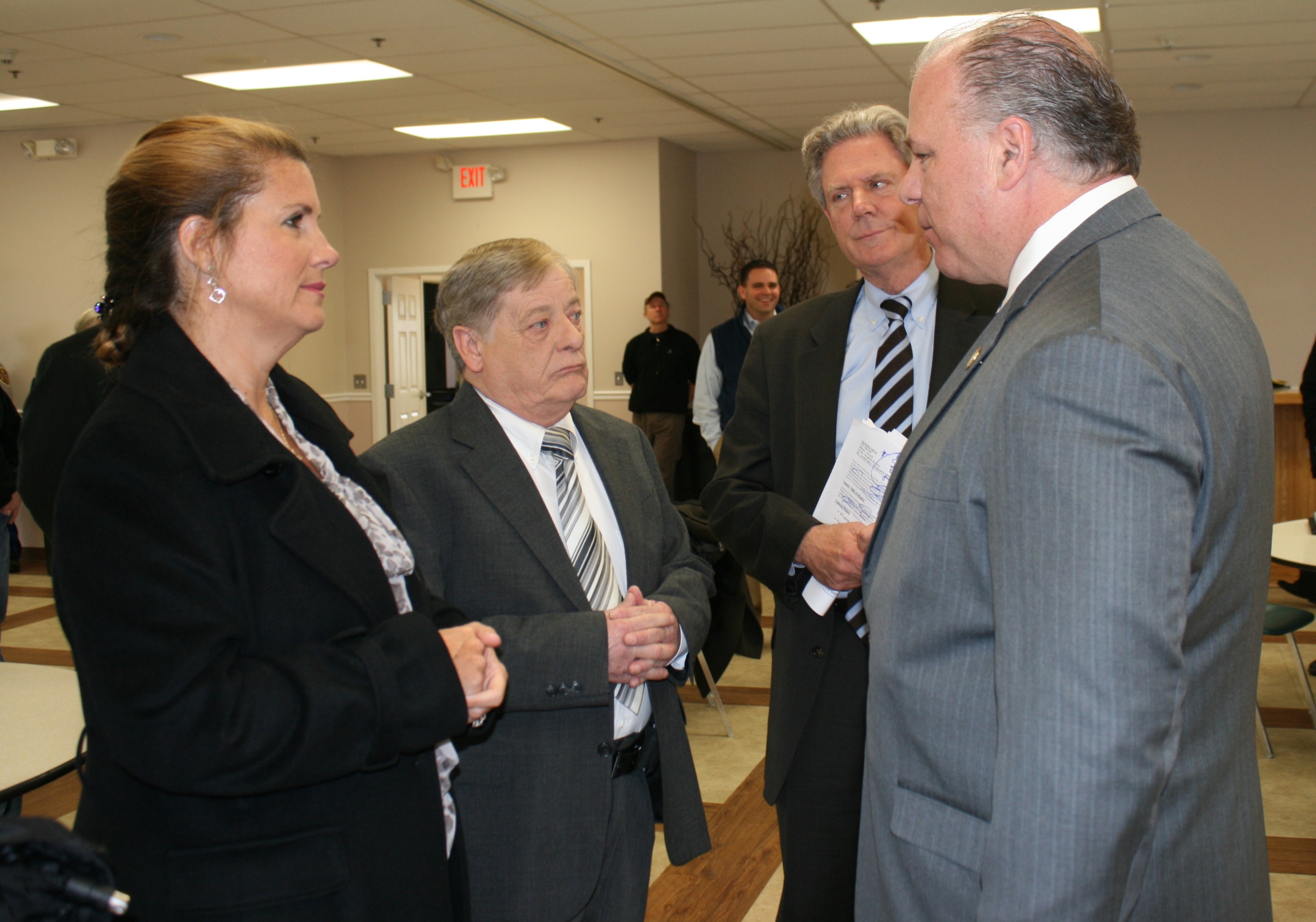Monmouth County Freeholder Serena DiMaso, Keansburg Deputy Mayor Jimmy Cocuzza, Congressman Frank Pallone and Senate President Steve Sweeney talk before Sweeney’s Town Hall Meeting in Keansburg. Pallone was not impressed. Click for larger view.