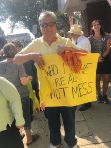 Monmouth County Democrats, led by former freeholder candidate Sue Fulton, Middletown committeewoman candidate Tricia Maguire, Red Bank Councilman Ed Zipprich and Councilwoman Kathy Horgan took the the streets of Red Bank on Saturday to protest Ocean Township Deputy Mayor Rob Acerra’s alleged use of a hot mess chicken emoji on the campaign facebook page of LD 11 Assembly Members Eric Houghtaling and Joann Downey.