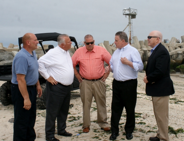 Pt. Pleasant Beach officials; Councilman Andy Cortes, Mayor Stephen Reid, Council President Bob Santanello meet with Congressman Chris Smith and Ray Bogan, legal counsel for the Marine Trades Association of New Jersey, Recreational Fishing Alliance, and United Boatmen of New Jersey, at the Manasquan Inlet. June 1, 1018