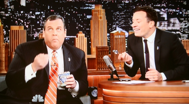 Jimmy Fallon wore a New Jersey lapel pin and Chris Christie ate some Ben and Jerry’s Tonight Dough ice cream last night during the Governor’s appearance on the Tonight Show.