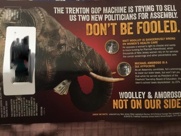 The Freehold Board of Education President who is one of the GOP candidates challenging the General Majority PAC’s obedient legislators is fighting mad about the deceptive mailer the Dems sent out last week accusing Amoroso of raising taxes 22% this year.